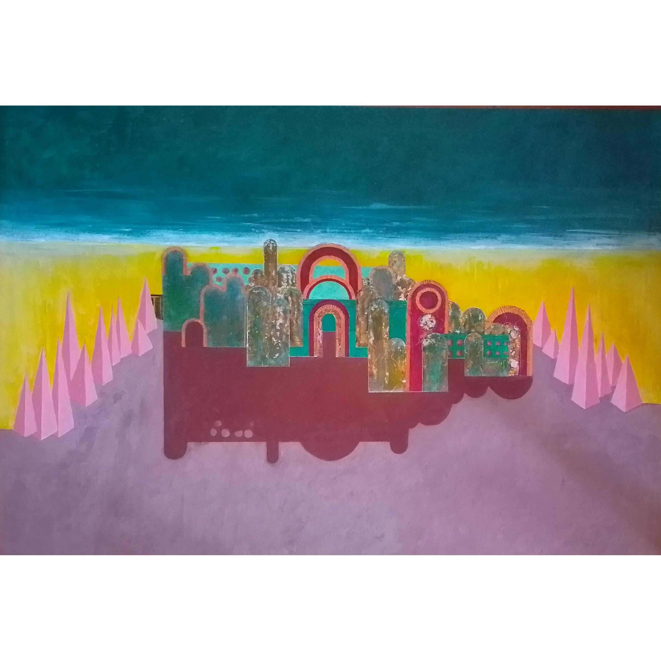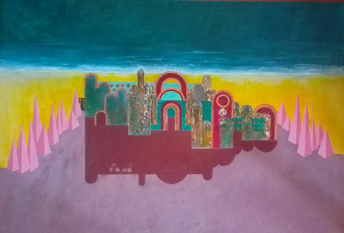 "Frontiera" è l'incontro tra l'ordine geometrico dell'architettura (definita dall'oro e dal rame) e il caos dell'energia. La Barriera Gialla è la vera fonte di luce. Se la luce non viene dal cielo, da cosa è fatta l'Ombra??L'opera gioca con la prospettiva per farci chiedere: le regole che vediamo qui sono quelle che valgono davvero? Un invito a cercare la propria soglia tra ciò che è logico e ciò che è inspiegabile. L'opera è realizzata con spessi strati di tempera all'uovo e arricchita con inserti di foglia d'oro, rame e argento. La materia è incisa e punzonata per creare rilievi e texture uniche."